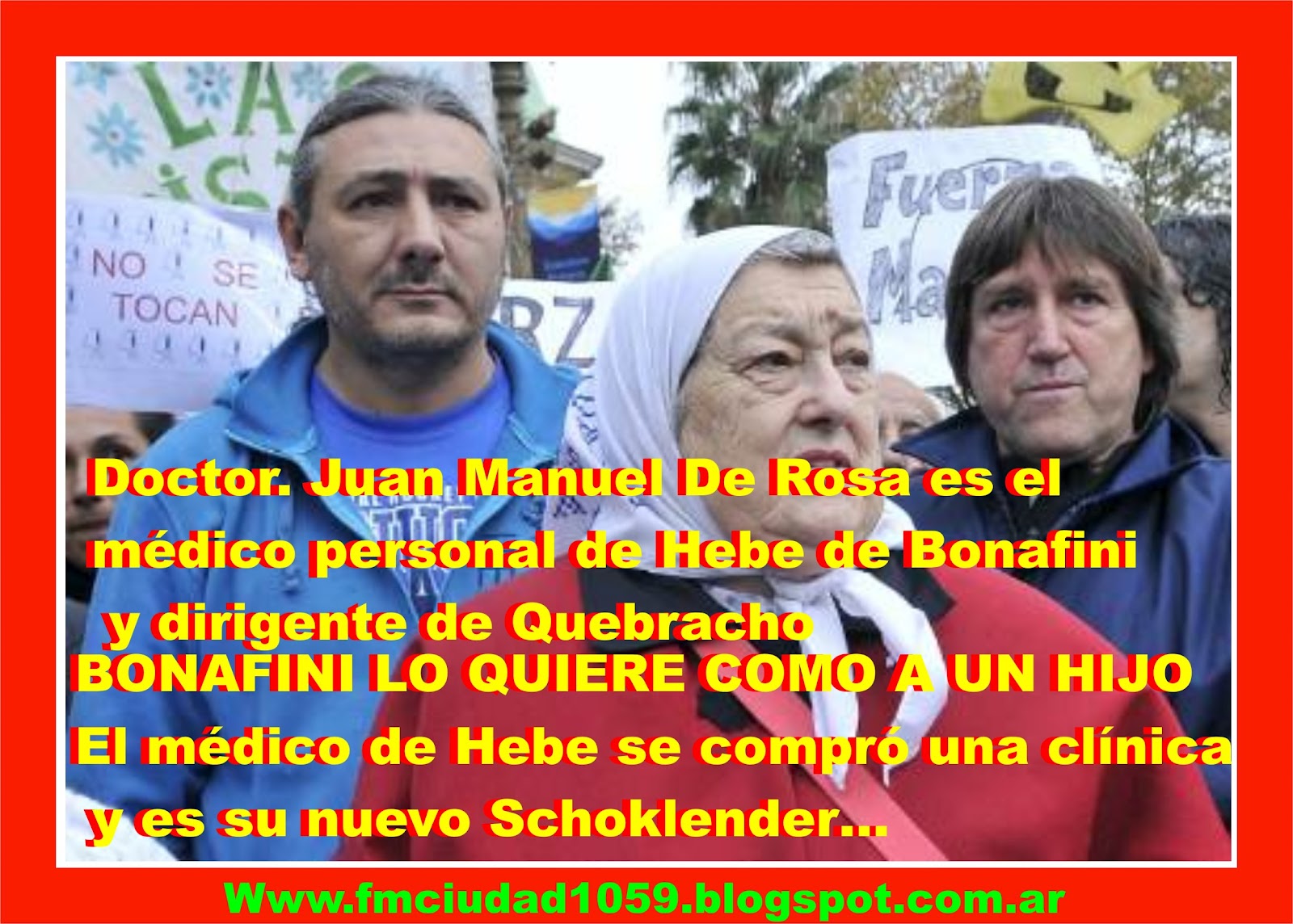 Juan Manuel De Rosa llama “madre” a Hebe de Bonafini, y ella lo quiere como a un hijo. Tras la pelea de Hebe con Sergio Schoklender por la investigación por desvío de fondos de la Fundación Madres de Plaza de Mayo, este médico de 44 años e integrante de la conducción nacional de Quebracho se convirtió en uno de los principales sostenes de la titular de Madres.