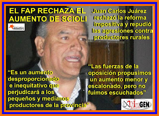 IMPUESTAZO de SCIOLI*Para el FAP, el impuestazo depende de "la pelea entre Scioli y CFK" Así lo afirmó el diputado provincial, Juan Carlos Juárez. Habla de un llamado de Nación a los legisladores K "para no negociar nada". Las cuentas de la provincia al rojo vivo.